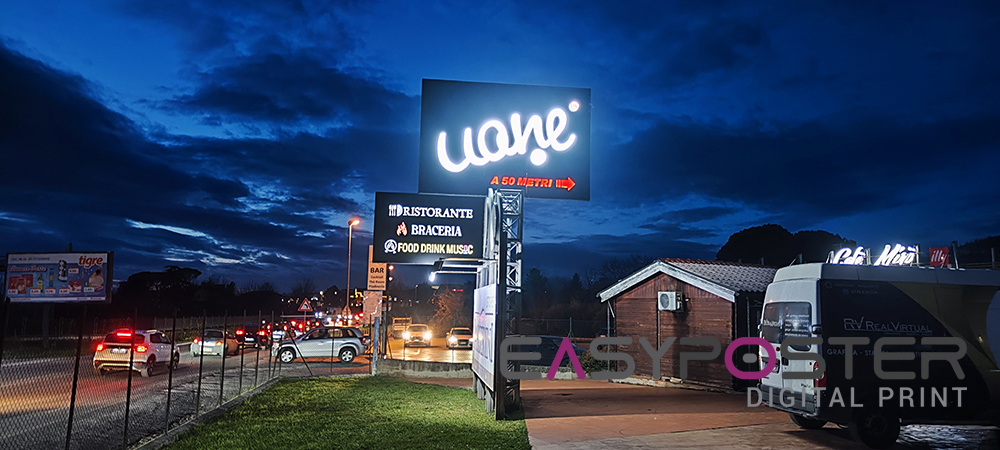 Il frontale in plexiglass nero garantisce un forte impatto visivo e un’estetica professionale, mentre la costa laterale in plexiglass opalino consente una diffusione omogenea della luce, tipica delle migliori insegne luminose LED in plexiglass. Le lettere possono essere realizzate con spessore variabile da 5 a 10 cm, adattandosi a diverse esigenze di visibilità dell’insegna e di design. Il fondello in PVC da 10 mm assicura robustezza, stabilità e lunga durata nel tempo.