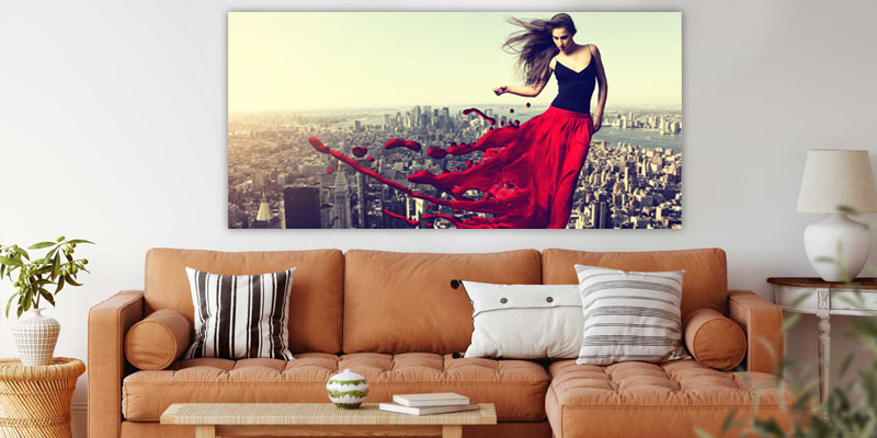 Quadro di donna con vestito rosso che balla su un cornicione di un palazzo e sul retro la ciità di New York.