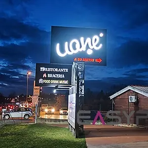 Il frontale in plexiglass nero garantisce un forte impatto visivo e un’estetica professionale, mentre la costa laterale in plexiglass opalino consente una diffusione omogenea della luce, tipica delle migliori insegne luminose LED in plexiglass. Le lettere possono essere realizzate con spessore variabile da 5 a 10 cm, adattandosi a diverse esigenze di visibilità dell’insegna e di design. Il fondello in PVC da 10 mm assicura robustezza, stabilità e lunga durata nel tempo.